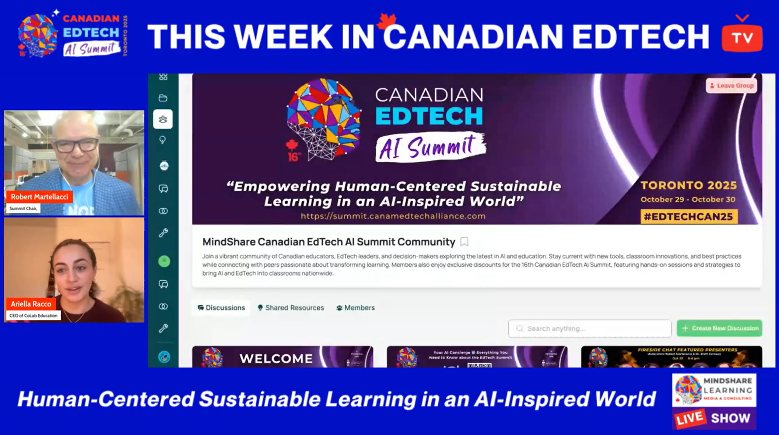 Hi everyone, I’m Ariella Racco, Co-Founder of CoLab, and I’m thrilled to be back on #MindShareTV with a very special ‘turning the tables’ podcast. We are just 1 day away from the Canadian EdTech AI Summit — and who better to join us than the Summit Chair himself, Robert Martellacci, Founder of MindShare Learning Media & Consulting! Robert, thanks for joining me. It’s been an incredible journey from pitch participant last year to official partner this year with CoLab!