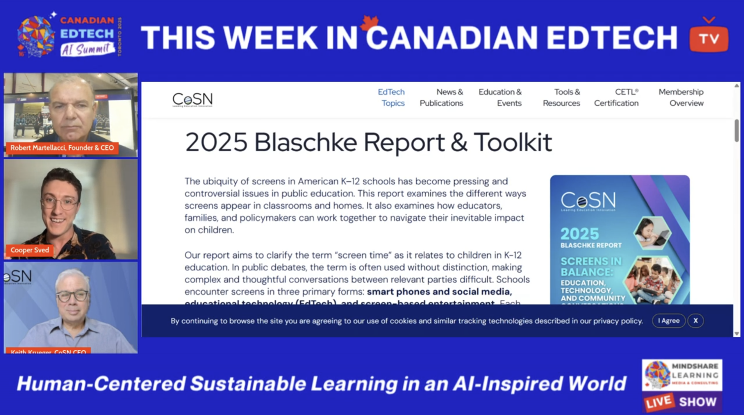 Welcome to another exciting episode of MindShareTV, where we explore the intersection of education, innovation, and leadership in a digital age. I’m your host, Robert Martellacci, Founder of MindShare Learning, and today I’m honoured to be joined by a global thought leader in EdTech, Keith Krueger, CEO of the Consortium for School Networking, CoSN & Cooper Sved, Educator & 2025 Blaschke Research Fellow at CoSN Keith and his team have just released an incredibly timely and important report: “Screens in Balance: Education, Technology, and Community Conversations”, also known as the 2025 Blaschke Report, authored by Blaschke Fellow Cooper Sved. We’ll unpack key insights from the report, explore the new Screen Time Toolkit, and discuss how educators and families can better navigate screen use in today’s connected learning environment.